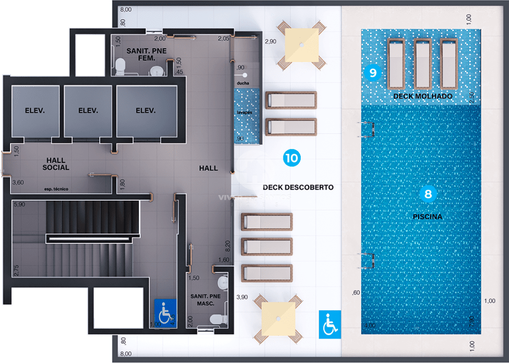 • Piscina com deck molhado e descoberto