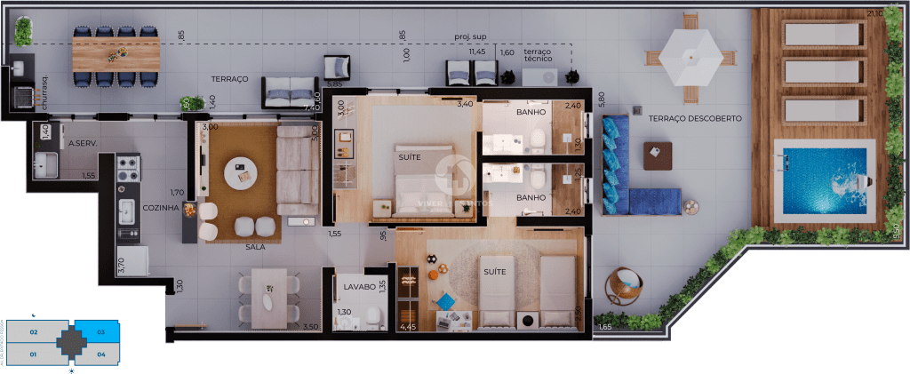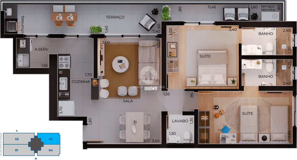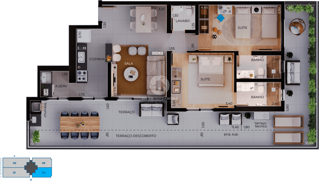 • 2 suítes – 84 m²